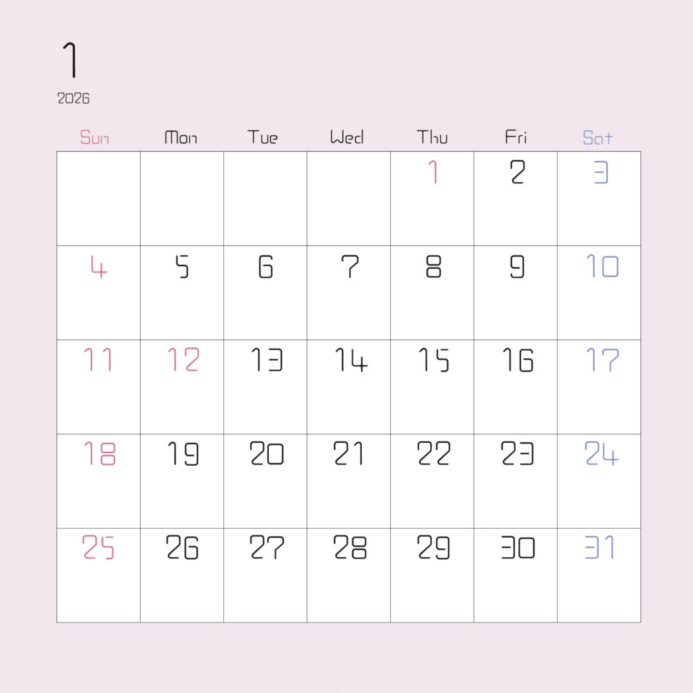 InstagramやPinterestで多くの反響をいただいている、2026年1月のカレンダー素材です。柔らかなピンクのニュアンスカラーと、洗練された細身のフォントを組み合わせた「大人可愛い」デザインに仕上げました。